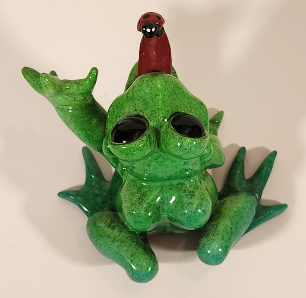 2009 Kitty Critters Bugsy Green Front with Ladybug On It's Tongue 3 1/4" Ceramic Figurine