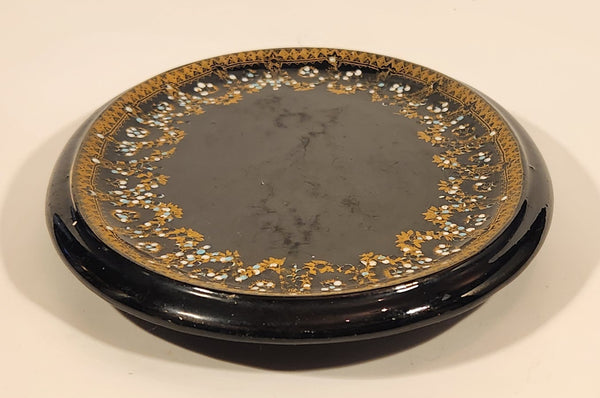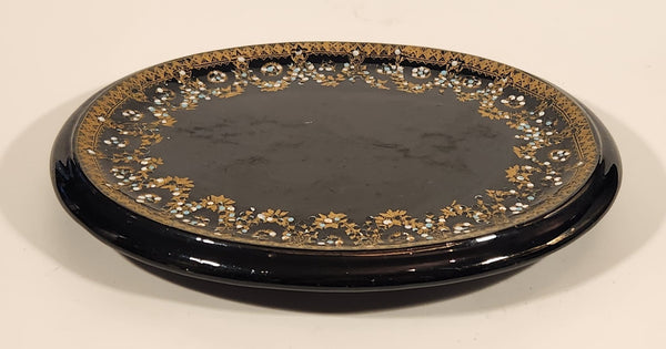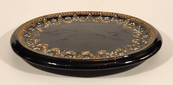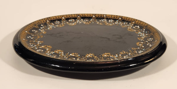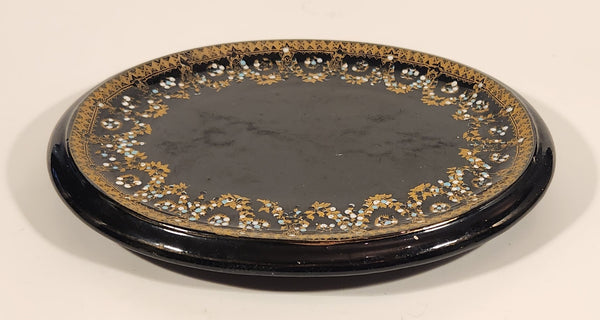 Antique 1800s Victorian Ornate Gold Pattern with Hand Painted Blue and White Dots No. G11 Black Oval 6 3/4" x 8 1/2" Papier Mache Mirror Plaque